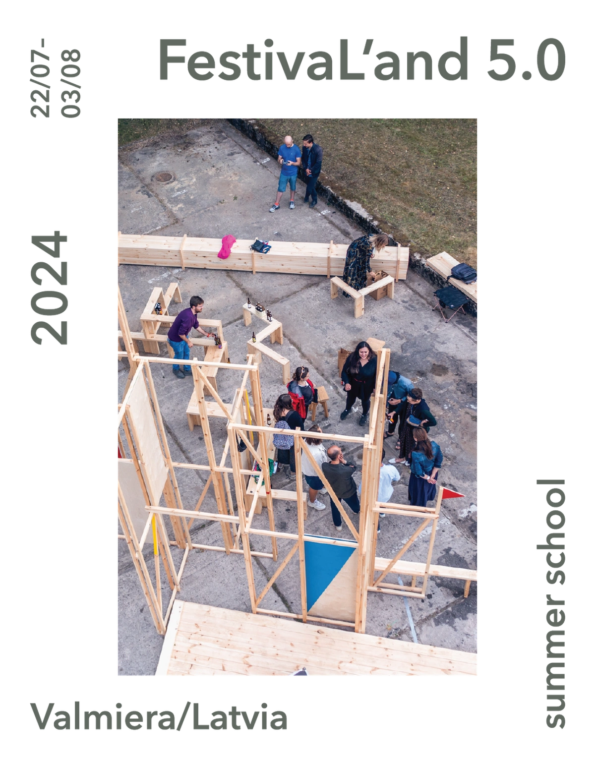 During the Summer School, international participants guided by tutors will work in teams and gain new knowledge, skills and experience in the process of design creation, from research, ideation, tectonic experimentation to 1:1 scale construction in the urban environment. "FestivL'and" is part of the contemporary theatre festival's annual event in Valmiera, Latvia.