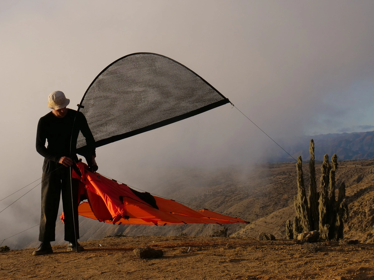 Fog-X jacket gives the user the ability to collect up to 10 litres of water each day. Even in the most arid areas on earth. With only a few steps of adjustments, the jacket can transform into a fog catching station that provides shelter for the user, while harvesting fog. The inflatable design of the jacket enables the user to be light and mobile in the landscape. Fog-X combines everyday objects with design that enables Individual users to take an active and intimate part of the ecosystem, while collecting the life sustaining resource water.