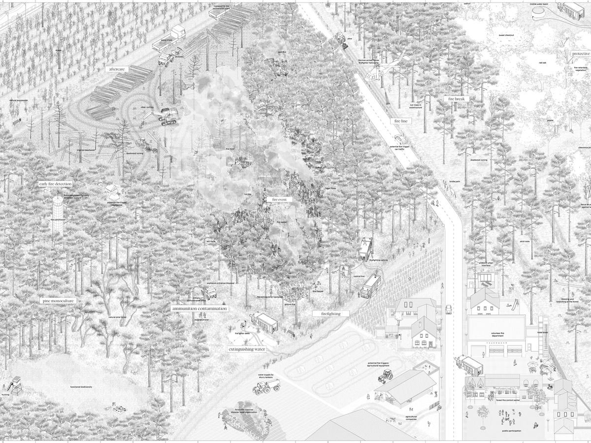 In the first part of the work, the collected knowledge is summarized in a book and illustrated with analytical drawings and diagrams. The book is extended by a map illustrating parallel processes and temporalities. In response to the increase in forest fires, the state Brandenburg is planning to establish a forest fire competence center for coordinated collaborations between various disciplines. Our design reinterprets the current planning for the center to include a public-effective level and creates hybrid structures that promote synergies of seemingly independent processes. Architecture can be seen as a mediator of the correlations in order to make them visible. These four structures, each dedicated to a specific aspect of wildfire management, organize the center as a decentralized network. The focus of the design concept is the transformation of individual knowledge into collective knowledge. Visibility and transformation of the buildings through use, time and volume are key aspects of the design and determine the appearance and functionality of the architecture. The hybridity in the designs and the constructive details themselves attempts to unite the two levels of poetry and reality of the forest habitat.