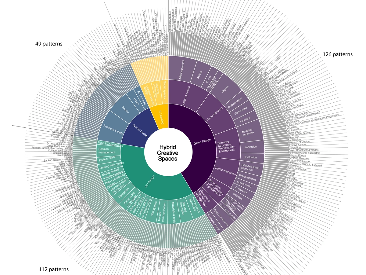 To design future hybrid creative spaces, this ongoing research project aims to develop an HYBRI-SPACE framework that addresses design issues from both physical and digital spaces, as well as to use a pattern language approach to bring together useful design guidance and digital tools from different disciplines. Moreover, this project could grow into a network that continues to extend and evolve with the input of knowledge and experiences from experts. Based on current findings, 323 proto patterns collected from 4 disciplines have proven their validity in the original context, and combing them offers a huge potential for solving problems that might not easily be solved in isolation, which is also in line with the interdisciplinary approach encouraged by many architects and pattern language theorists.