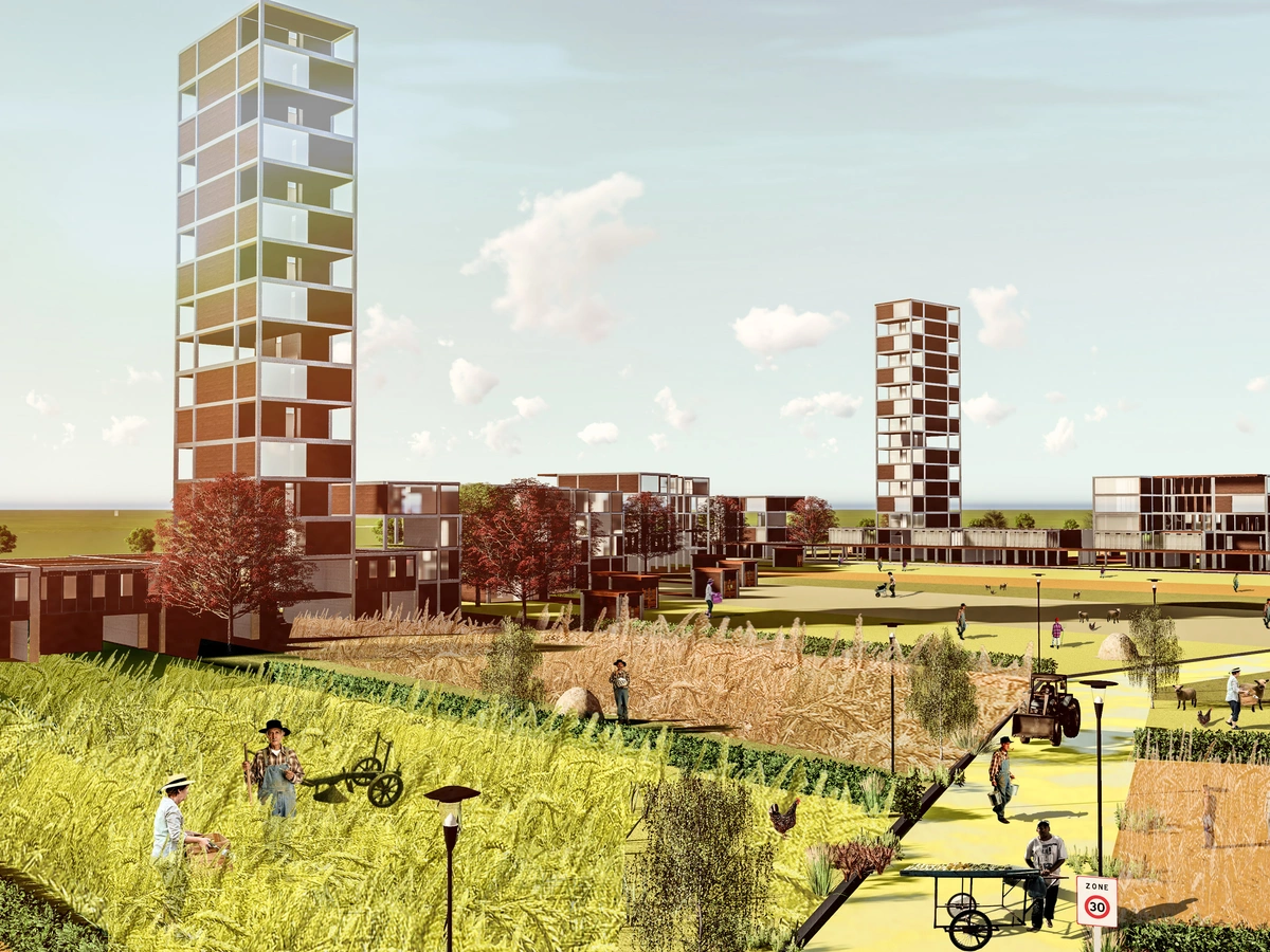 At the heart of this vision lies a thriving settlement integrating a housing band and interconnected objects, sustainably preserving agricultural land through urban agriculture. The conscious use of natural resources, circular economy principles, and community bonding drives sustainability.