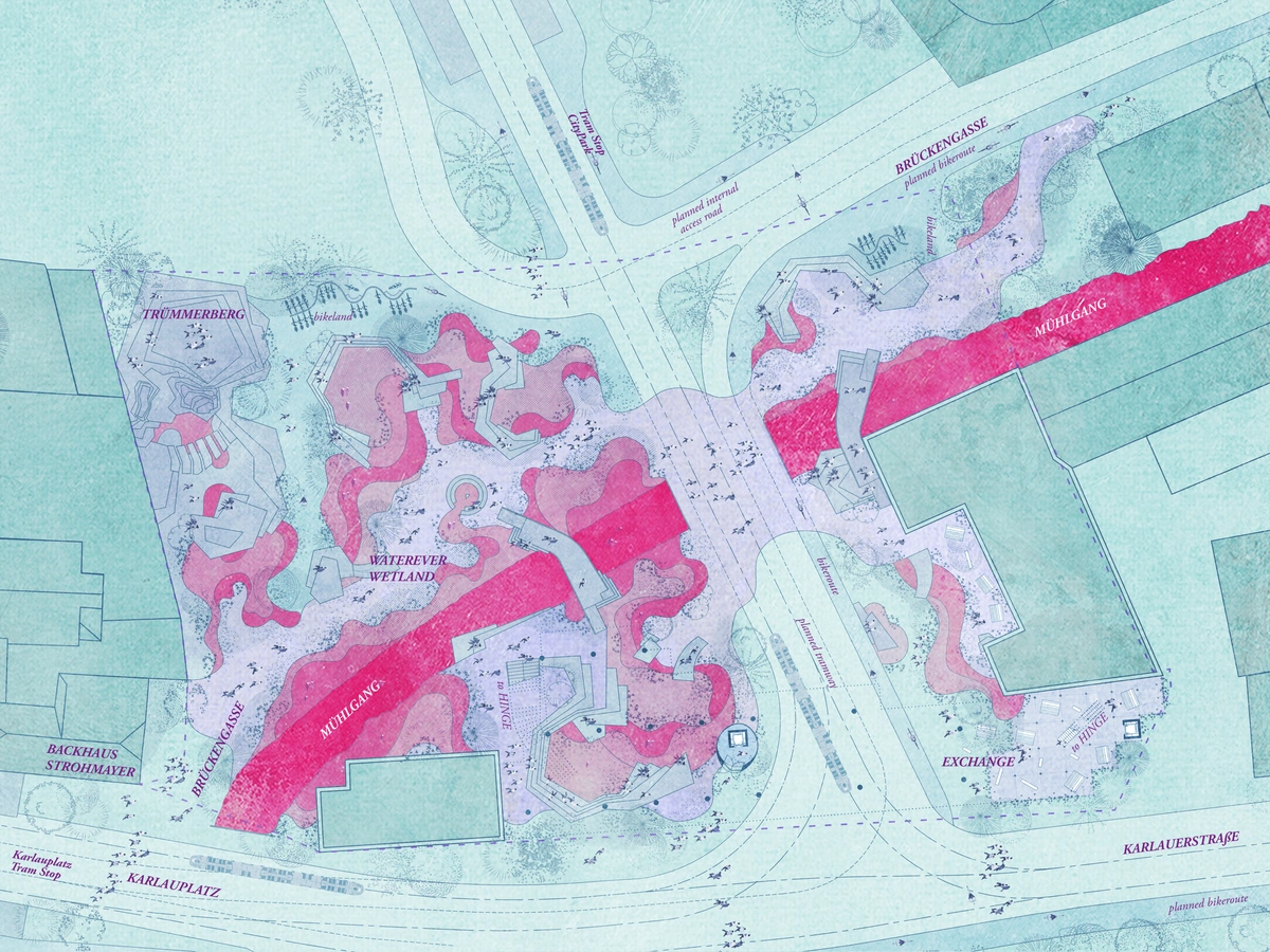 Both the wetland and thermae advocate for deeper interconnections between nature and human experiences through time. Like the course of a river, FREE MÜHLGANG will gradually sediment with the passage of time: different meanders will appear as the project gradually adapts to new consumer policies, to its new human and non-human inhabitants, to the new and changing urban and wild lives that it hosts, to the drift of society and to climate change. In doing so, the project seeks to continue and augment the historically participatory trajectory of Graz, giving a leading role to minority groups that may have been previously excluded.