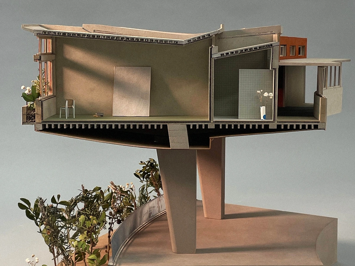 The project proposes the conversion of the building complex into a cultural centre. While the original façades will be restored with only minor adaptations to bring them up to contemporary standards, the interior of the former children's sanatorium will be redesigned for its new purpose. This will involve creating a more open and connected ground floor comprising exhibition spaces, workshop spaces and communal areas. The most striking part of the complex — the elevated ring — will house artist residencies in converted former children's sleeping units. The building's function and capacity differ between the warm and cold months of the year, as do the levels of insulation in its interior spaces. These differences form the basis of the thermal concept. The materials and colours of the original interior spaces will be further developed in relation to the existing building and its surroundings. The result is a playful sequence of spaces that breathe new life into the extraordinary building through a hybridisation of tourism and culture.