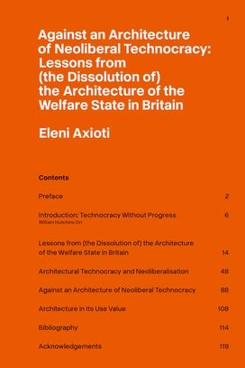 This project proposes a book, which as another history of the present will problematize the contemporary disappearance of architecture of social welfare. The book addresses the dismantling of the welfare states from the 1980s onwards in Europe and the transition to a state of neoliberal technocracy. The book argues that it was through the proliferation of specific technocratic operations in the production of the built environment, that these changes became possible and the deployment of neoliberal forms of governance was facilitated, as actions at a distance that direct our behaviours. The chapters of the book scrutinise a series of buildings produced for institutions of social welfare such as hospitals, schools, universities, housing estates and public spaces and trace their gradual transformation. It discusses the changes that took place, the transfer of responsibility from the institutions of the state to the individual, the remodelling of social rights into personal responsibilities and objects of private enterprises. The book aims to present the gradual withdrawal of the state from the planning and production of the built environment and the practices that realised the generalisation of competition and of the enterprise as the model of producing the built environment. These practices relied on the self-regulation of the market, leading to deregulation in the production of the built environment, the prioritisation of profit, the extreme commodification of architecture, and its use as an instrument of financial speculation. The extensive privatisation that took place, are addressed through the effects that these have on the creation of new enclosures in the cities, and the increase of financial speculation and inequality, which define the contemporary cities. This book aims to be a critique and a call to re-define the role of architecture as a mechanism of social government, where the use value of architecture is prioritised against its exchange value.