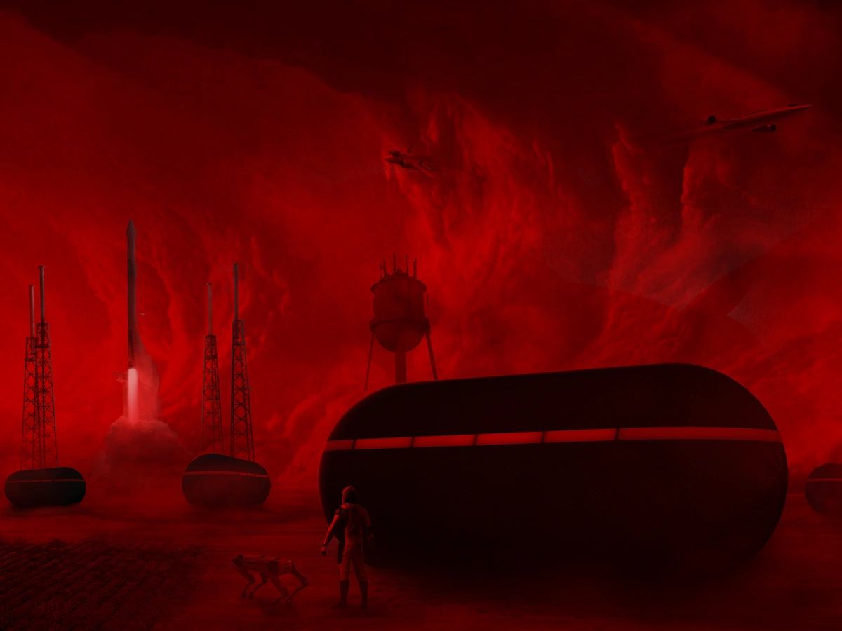 The shape of the structure is in the form of a pill, with minimalist material use, in order to achieve the desired futuristic feeling. Slick, durable and robust design enables multi-use of spaces in various enviroments. Roof solar cells provide power, together with methane created from organic waste. Water is collected from air and atmosphere or created on the spot. Air filtration, waste reuse and future technologies ensure survivability in all conditions. Modularity of structure fulfills ever rising need for affordiable housing, espechilally now with climate disaster unfolding. Spaceous bathroom, lift or storage, kitchen and control zone provides space for two people. Modules can be expanded verticaly, adding elevator communication between each. Belly side of "pill" is for battery, resource tanks and mechanical equipment and top side is for storage, hidden away from the plain sight.