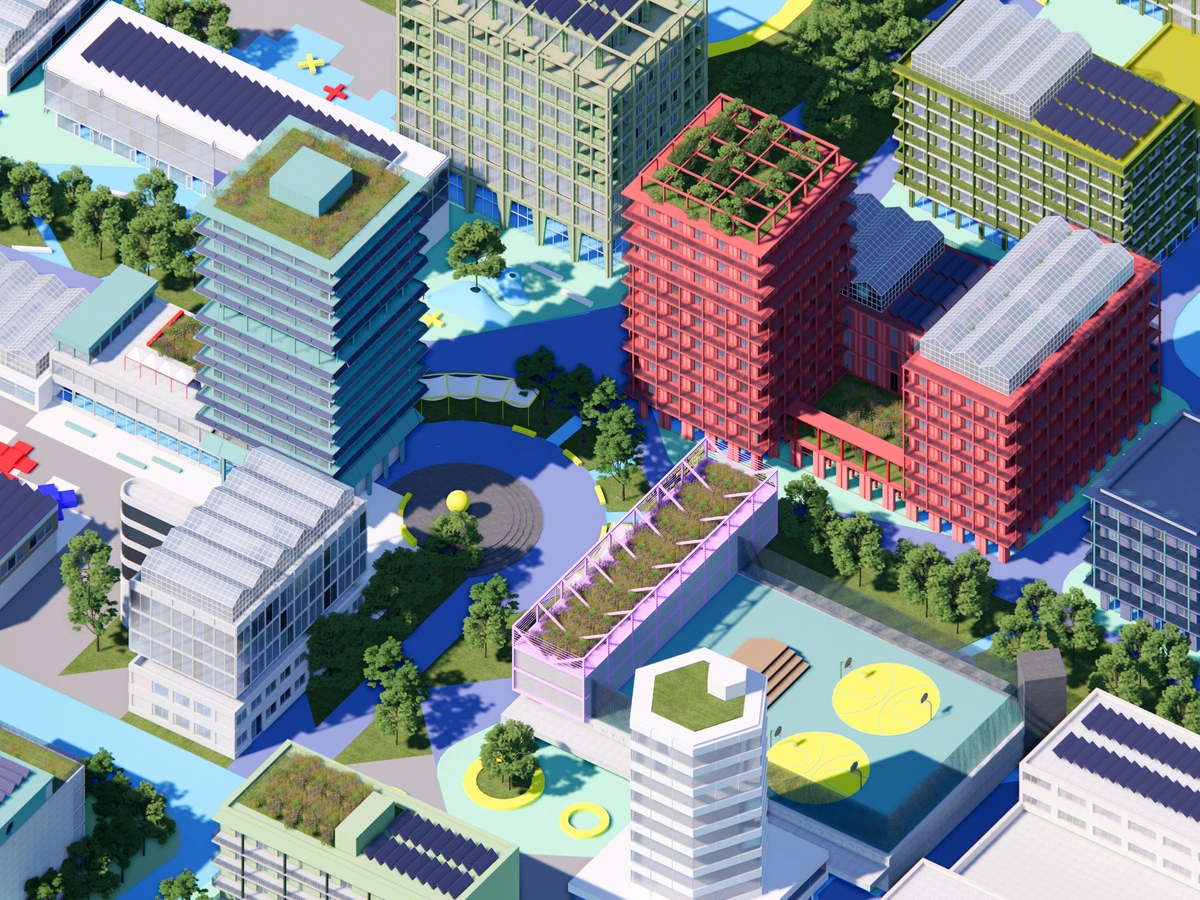 Sustainable architecture here means reuse of materials, low-emission and toxin-free construction, minimal land sealing, and flexible buildings designed for future adaptation. Green and blue infrastructure such as vegetation, water elements, and microclimate-responsive landscaping protect against heat and extreme weather.