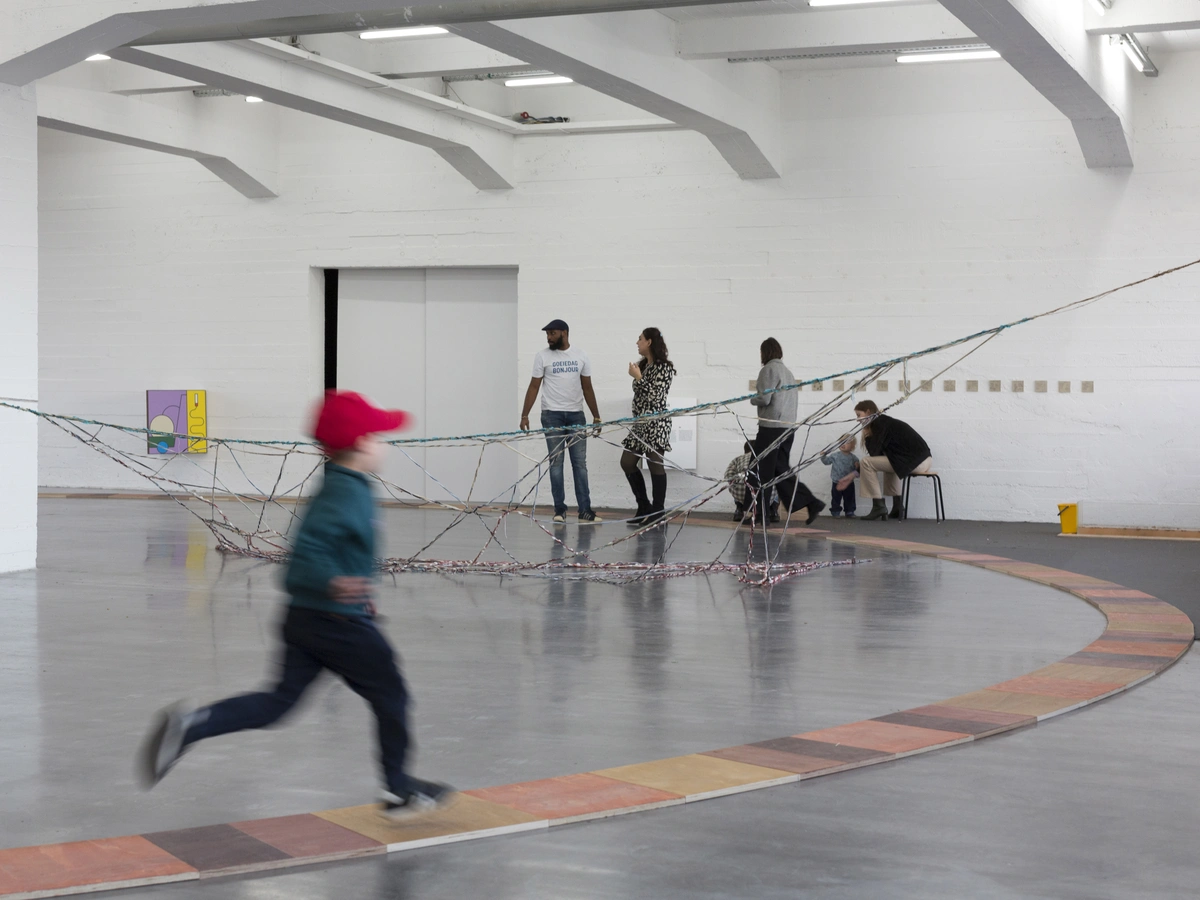 One precedent for this approach is Heaven on Earth, our project created for WIELS during Francis Alÿs' exhibition 'The Nature of the Game’. Taking inspiration from the playing children of Alÿs' videos, the artwork challenges visitors to play with, in, and around art. The installation gives the traditional game of hopscotch a special twist in an adapted version for the playweek at WIELS. The start and the end of the game are connected in a loop where “earth” and “heaven” meet each other at the entrance of the space. Built from repurposed materials from the gallery itself, this intervention demonstrated how waste can be transformed into opportunity, and how play can become a tool for environmental reflection.